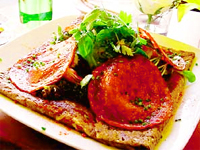 クレープというと、薄く焼いた柔らかい生地で、クリームと具材が巻かれるように折りたたまれた姿を想像しますが、ガレットは固く焼いた生地の真ん中に具材がたっぷりと乗っていて、具がこぼれ落ちないように、生地の端が中心に向かって正方形に折られています。 これをナイフとフォークでいただきます。