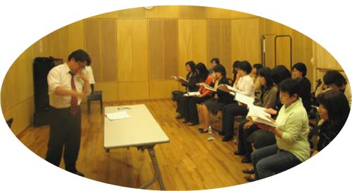 まず、圧倒されたのは、常任指揮者でいらっしゃる石野健二先生の指導法です。「声帯を下げて・・・」とか、「おでこを支点に前に首を回転して・・・」「今度は後ろに立てる感じ・・・」とか、なんだか変わった表現を使って、指導されます。