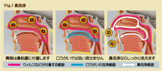 のどをうがいするように、鼻の中に付着した花粉や菌を洗い流すことができれば、風邪、インフルエンザ、そして花粉症の予防になります。(Fig.1)