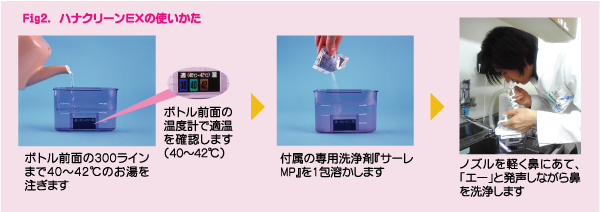 専用洗浄剤(成分:塩化ナトリウム・メントール・ペパーミント)を溶かし入れ、ノズルをセットすれば、あとはいよいよ鼻の洗浄です。(Fig.2)