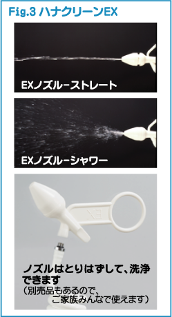 続いて携帯用のハナクリーンSを愛用している院長も、ポンプ式のハナクリーンEXに挑戦。「ハナクリーンSと違って、ノズルの切り替えで水流の調節ができ、ポンプの強弱で微妙な水圧調整もできる。またノズルを取り外して、洗浄消毒できる(Fig.3)ので、院内で患者さんにも試してもらえる」とご満悦の様子。