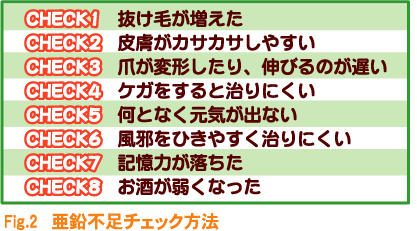 亜鉛は、私たち人間のからだにも微量ながら含まれており、鉄や銅などとともに、生体内必須微量元素と呼ばれます。酵素の成分や蛋白質の合成、味覚への関与、インスリンの生成や機能への関与、また免疫能の賦活や生殖機能そのものなどに重要な役割を果たす亜鉛は、その欠乏によって、ちょっとした異常や病気を引き起こすことが知られています。(Fig.2)