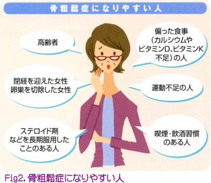 骨粗鬆症は女性に多い疾患といわれています。これは、閉経を迎えた女性では骨形成を助ける働きを持つ女性ホルモンが少なくなるためです。ほかにも、高齢者、カルシウム不足、運動不足、ステロイド剤を飲んでいる、過度のダイエットなどが危険因子といわれています。(Fig.2)