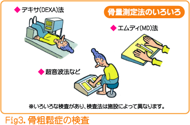 骨粗鬆症を診断するには、X線検査や骨量測定、血液/尿検査などがあります。自覚症状がなくても骨量が減少していることがあるので、症状がある場合はもちろん、ない人も積極的に検査を受けましょう。検査での痛みはほとんどありません。(Fig.3)