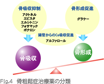 骨粗鬆症に治療は、上の3原則が基本です。しかし、骨折の危険が大きい場合には、薬による治療もあわせて行います。(Fig.4)