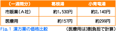- 漢方薬は高くないの?との疑問もあるかとおもいますが、お医者さんからもらう医療用漢方製剤は健康保険が適用されているのです。市販薬より安価になるのです。(Fig.1)