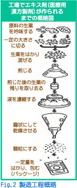 - 煎じ薬を独自の手法で乾燥させて飲みやすくした者です(Fig.2)。つまり煎じ薬と同じ成分です。インスタントコーヒーをイメージしてもらうとわかりやすいと思います。