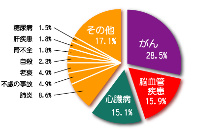 グラフの通り、日本人の死因のうち、がんに次ぐ脳血管疾患、心臓病は高血圧によってもたらされるものです。2つを合わせると31%で、28.5%のがんよりも多いのです!