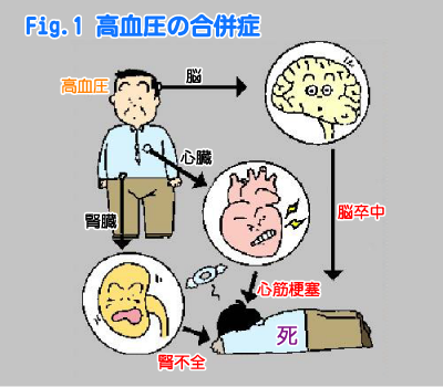 高血圧になると、脳出血や脳梗塞、腎硬化症、心筋梗塞、心不全などさまざまな合併症が起こる可能性の非常に高い病気です。(Fig.1)