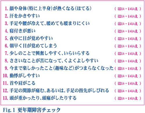 当院では、問診の際、Fig.1のようなことを伺います。更年期障害かな、と思ったら、いくつかあてはまるものがあるか、やってみるのもよいでしょう。