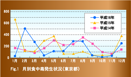 しかし、夏期には腸炎ビブリオなど細菌性のものや、病原体で汚染された食品によっておきる胃腸炎、いわゆる「食中毒」が増加します。食中毒統計によれば、食中毒の70〜80%は7〜10月に発生しています。(Fig.1)