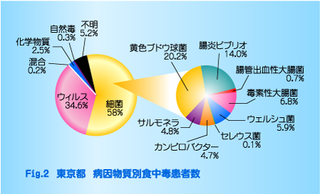 日本人は以前は魚介類と密接に関わる密接に関わる腸炎ビブリオによる食中毒が圧倒的でした。しかし近年、食生活の欧米化で魚離れが進み、乳・肉・卵類を食材とする料理や洋菓子が好まれるようになったのに伴い、サルモネラやウェルシュ、カンピロバクターなど、家畜の腸管に由来する菌が増えています。(Fig.2)