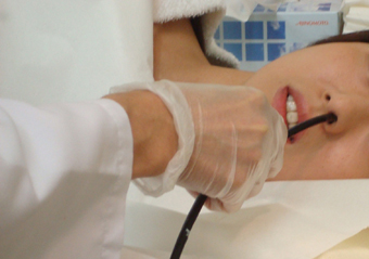 Dr.「通りのいいほうの鼻から内視鏡がはいります。鼻が狭い方は少し出血することがありますが、心配いりません。鼻の中を通過するときは少し痛いかもしれませんが、のどまで到達すると、痛みは軽くなります。のどに内視鏡が来たら、軽く飲み込んでください」