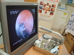 黒くて細い管の先には、小さなライトが付いていて、すでにカメラも作動しているらしく、モニター画面も映っています。いよいよ、鼻から管が入ります。最初、右に入れましたが、通りが悪かったらしく、左に入れ直し。今度は、何とか管が進んでいきました。少し鼻腔が狭いとのこと。モニターには、鼻の穴、鼻の奥が映し出され、のどまできたときに、飲み込んでくださいと言われ、こくんと飲み込むと、簡単に入っていきました。