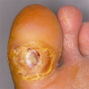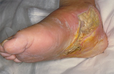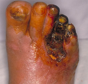 特に気をつけなくてはいけないのは、神経障害が進行して神経が壊れ、足の感覚がなくなることです。例えば、ちょっとした靴ずれや、やけどに気づかず、傷が悪化して、足が腐った状態(壊そ)になり(Fig.2)、最後には足を切断しなければならない場合があります。また心臓の神経も壊れて働かなくなることから、 心筋梗塞になっても分からず、突然死を起こすこともあります。