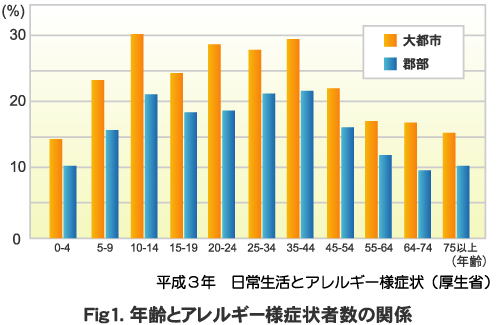 アレルギーによる皮膚炎や、ぜんそくなど、アレルギー反応を起こしやすい体質である場合は、花粉症にもなりやすく、アレルギー体質は、遺伝するので、家族に鼻のアレルギーや、気管支ぜんそく、アトピー性皮膚炎などの患者がいる人は要注意です。日本人の約15%が、花粉症など、鼻アレルギーといわれています。年代でみると20歳代、10歳代、30歳代と多く、60歳代以降は少なくなる傾向がみられます。