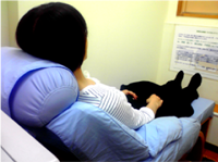 腰回りにコルセットを巻き、牽引ベッドに仰向けに寝ます。ベッドに身体を固定するために、膝の下に山型のクッションを置き、両脇に固定具をセットします。スイッチが入ると、足のほうに向かってゆっくりと引っ張られていきます。腰から背中にかけて、じっくりと伸ばされ、ちょうど気持ちよいと言うところで少し止まって、今度は引っ張る力が緩みます。体幹のゆがみの矯正にも効果がありそうです。