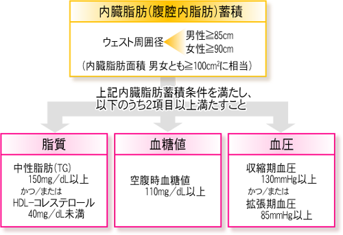 ウエスト周囲径が基準以上で、脂質、血糖値、血圧の3項目のうち、2項目以上に異常値がある場合、「メタボリックシンドローム」と診断されます。