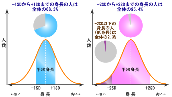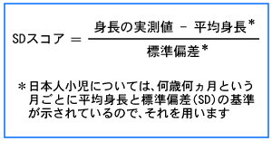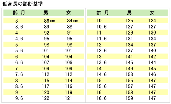 同じ年齢、同性の平均身長より2標準偏差(-2SD)以上下回っている場合を、低身長と定義しており、全小児の約2%が低身長に該当しますが、内分泌異常など治療の対象になる低身長はそのうちの5%以下です。