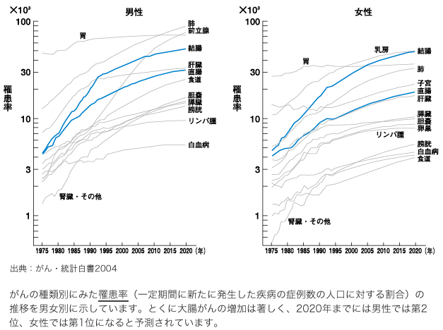 大腸がん(直腸がん、結腸がん)になる人が、急激に増えており、2001年には年間10万人を越え、2020年には胃がん、肺がんを抜いて日本人のがん罹患率第一位のがんになると予測されています。