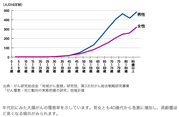 大腸がんは男女とも40歳を過ぎると急に増え始めます。