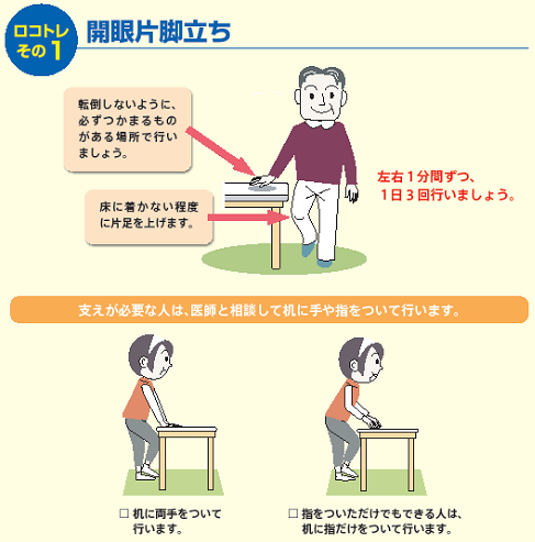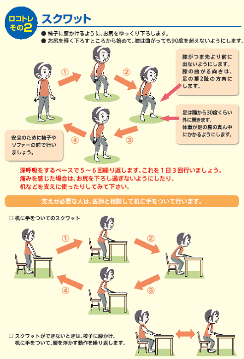 ロコモティブシンドロームが疑われるが三大疾患がない場合、またそれらがあっても治療の経過中に医師から許された場合は、運動訓練が有効です。高齢者の介護予防にはゆっくりとした動きを伴う筋力訓練をバランス訓練が有効で、ロコトレには片足起立訓練とスクワットを採用されています。