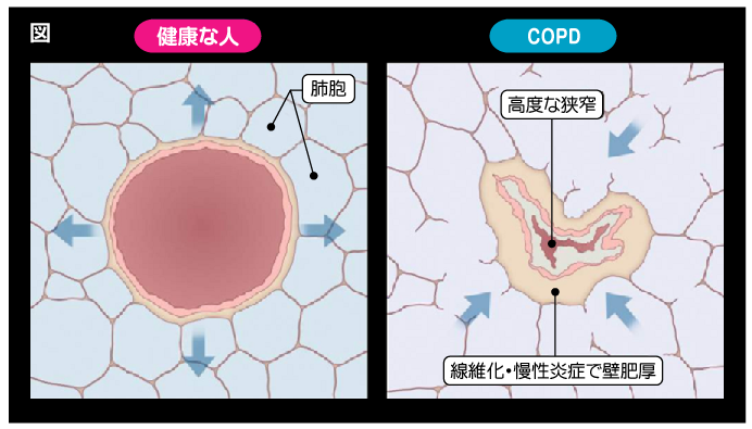 健康な人の気道内部は、呼吸に十分なだけの空間が保たれています。しかし、COPDになると、慢性的な炎症により気道の壁がかたく厚くなると同時に、気道内部に粘液がたまるため、気道が狭窄して慢性的な呼吸困難がおこります。(図)