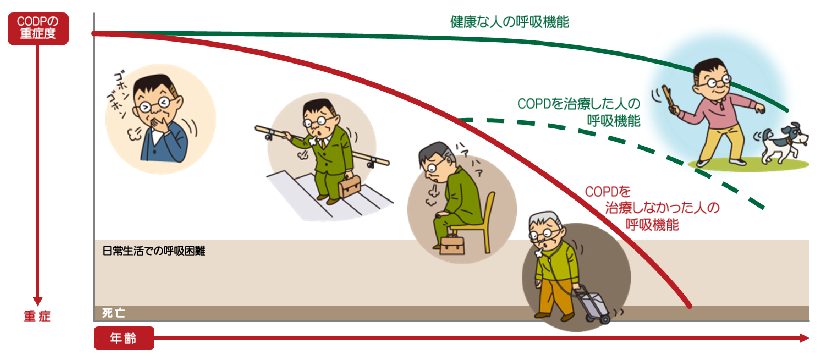 COPDを放っておくと、呼吸機能の低下から、体を動かすことが困難になり、寝たきりの生活を送ることになってしまいますが、早期に診断し、適切な治療を継続することで、呼吸機能を維持し、今と変わらない生活を送ることができます。