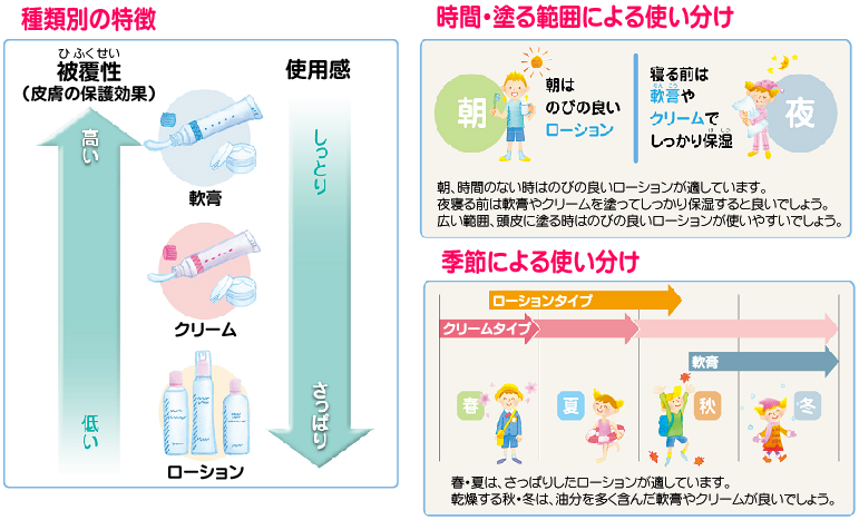 また、時間のない朝はのびの良いローションを使用し、夜寝る前は軟膏やクリームを使用してしっかり保湿する方法もあります。