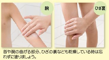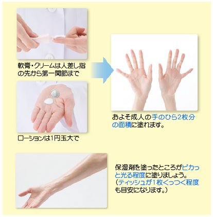 また、保湿剤を塗る前に手をよく洗いましょう。傷のあるところには塗らないようにしましょう。