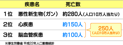 脳血管障害、心筋梗塞は、動脈硬化を原因として起こる病気です。