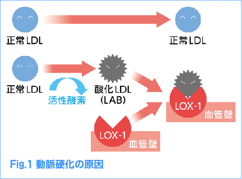 酸化LDLは、血管にあるLOX-1というトラップに捕まります。これが、動脈硬化のはじまりです。(Fig.1)
