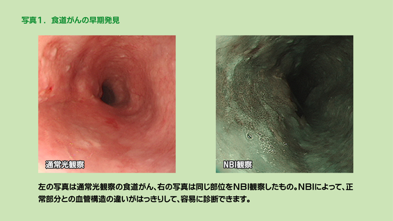がんの組織の表面には、通常には見られない異型な毛細血管が走行していることが多いのですが、表面の細い血管を、通常の光の元で肉眼で観察することは難しのです。しかし消化管の表層の毛細血管を強調して描出できるNBI観察を行なうことによって、これまでは発見するのが難しいがんの発見が可能になります。