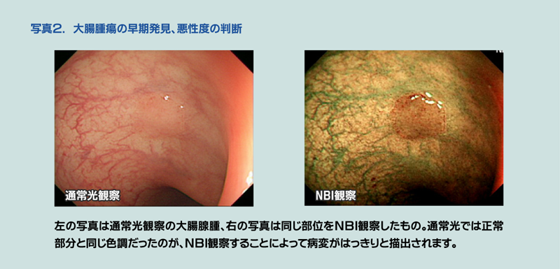 特に咽頭がんや、食道がんの早期発見(写真1)や、大腸腫瘍の早期発見、悪性度の判断(写真2)に威力を発揮します。
