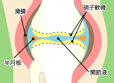 膝関節は大腿骨と脛骨のつなぎ目にある関節で、大腿骨側が凸、脛骨側が凹の組み合わせで、関節が滑らかに動くように、2つの骨の接する面は硝子軟骨でできていて、骨の間にはクッションの役割をする半月板があり、関節の中は潤滑剤の役割をする関節液で満たされています。
