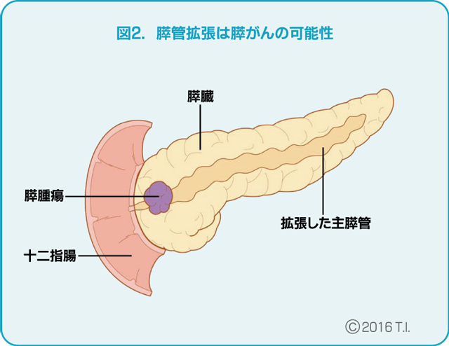 腹部超音波検査では膵臓全体を完全に観察することは難しいのですが、がんが発見できなくても、膵管拡張がみつかることがあります。膵管は消化液である膵液を十二指腸に分泌する、膵臓を貫く径1ミリ以下の細い管なのですが、何らかの原因で膵液の流れが悪くなると、膵管が太くなってきます。その原因が膵がんである可能性があるのです。(図2)