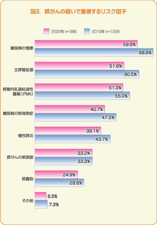 この386人に、重視するリスク因子を複数回答で聞いた結果(図3)、「糖尿病の増悪」が最多の59.6%に上った。2019年10月に行った同様の調査でも、糖尿病の増悪が68.8%で最も多く、同様の傾向にあった。次いで「主膵管拡張」が51.6%、「膵管内乳頭粘液性腫瘍(IPMN)」が51.3%となった。