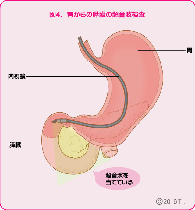 腹部超音波やMRI検査で膵管やのう胞、IPMNに変化がある場合や腫瘍マーカーの上昇があった場合には、提携施設に超音波内視鏡検査をお願いしています。超音波内視鏡は、先端に超音波の端子がついている内視鏡で、胃の中から隣接する膵臓を超音波検査するイメージです。そして、超音波内視鏡下で、胃の壁から膵臓の病変に対して、針を刺して組織を採ることもできるので、正確な診断が可能になります。(図4)