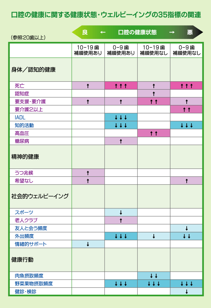 (矢印の数はP値(結果の確からしさ)に基づく。矢印3つ(p<0.0014)は、より確かな関連を示し、矢印2つ(p<0.001)、矢印1つ(p<0.05)と順に結果の確からしさが弱くなることを意味している。また、矢印の向きは指標の確率の方向性を示している。例えば、0-9歯の者は死亡する割合が有意に高く、口腔の健康状態が悪い者ほど果物野菜摂取頻度が有意に低いことを示している。)