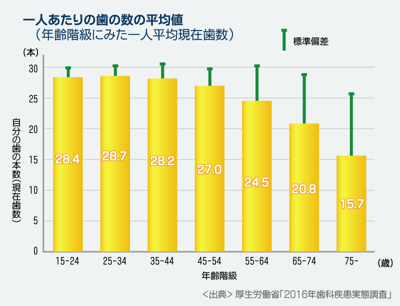 高齢になると残っている自分の歯の数は少なくなり、2016年の厚生労働省の調査では、です。後期高齢者の平均値は約16本で、20本以上の歯を持つ人は46%、約3割の人が総入れ歯を使っています。